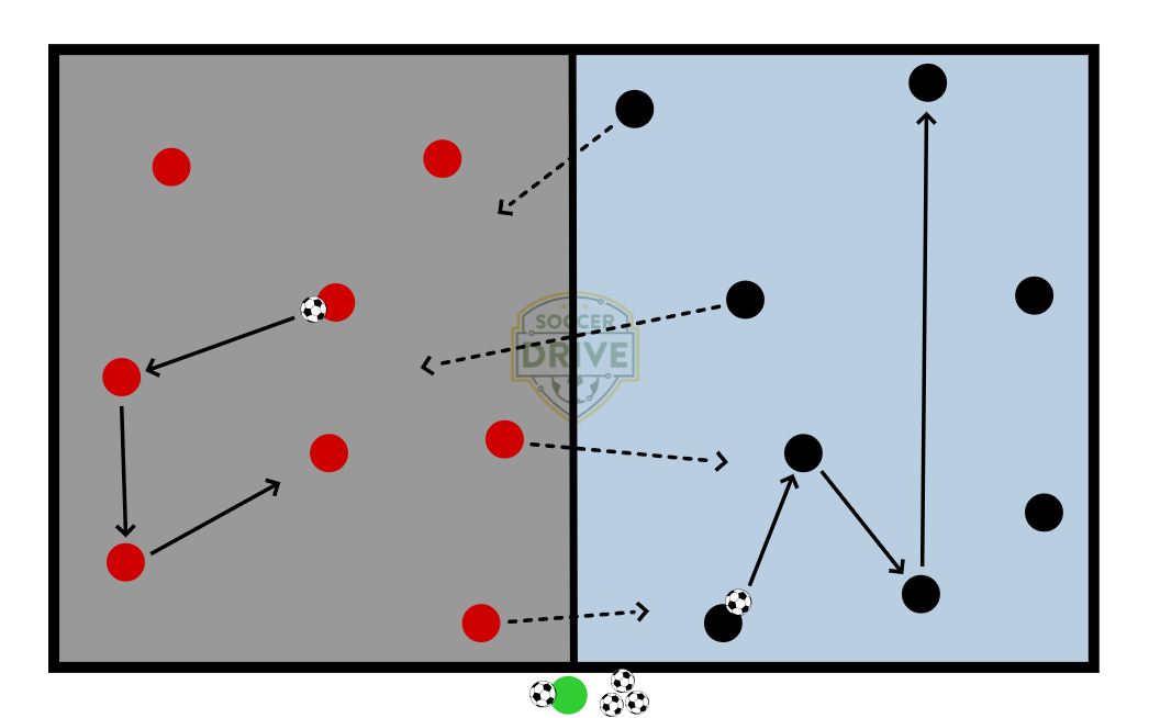 16 players are split into two groups of 8, with the teams passing the ball around within their half. On the coach’s signal, the groups send two players into the other half as defenders in a 6v2. Teams score one point for winning the ball. After 3-5 minutes of 6v2, the players go back into their own half. At the next signal, two new players go the other half as defenders.