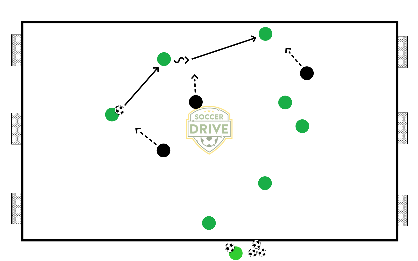 Two teams play 5v5 on a small field, with each team defending three small goals set up on their end line. There are no goalies and players cannot just stand in front of the net. When a team scores, the coach immediately plays a ball to the team that was scored on. Games are played to three goals.